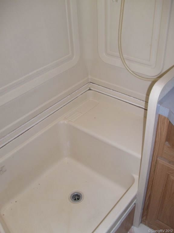- Smaller shower with shower curtain instead of glass doors. Added an Extend-A-Shower to get more space and hang wet things. It really works!